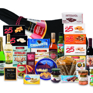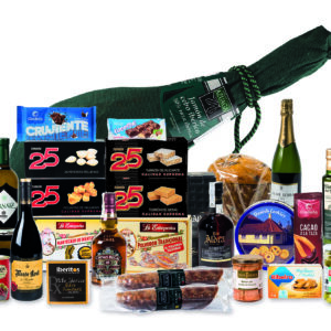 Artículos sobre cesta de latón en varios colores y envueltos en papel decorativo.